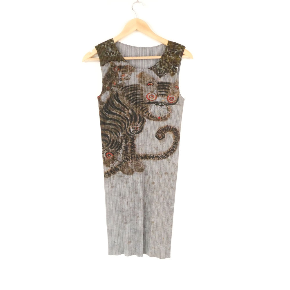 プリーツプリーズ イッセイミヤケ Tiger Cat Korean Fork Art Minwa Dress PP83-JH719 ロング丈ノースリーブブラウス 3 AY6779W1